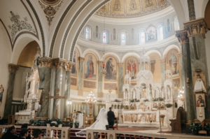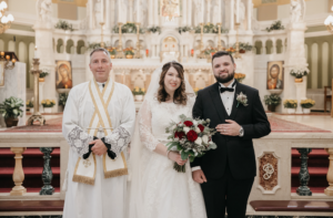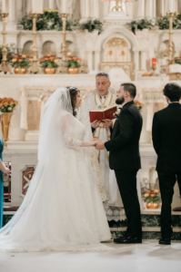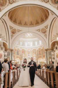 Their wedding was held on a golden fall day on October 15, 2021. After sharing a kiss at the altar, they also incorporated a unique European Catholic tradition: the marriage crucifix kiss.