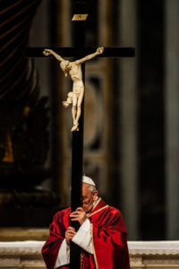 April 3, 2015: Pope Francis holds the cross during the celebration of the Lord's Passion, in St. Peter's basilica at the Vatican, Friday.